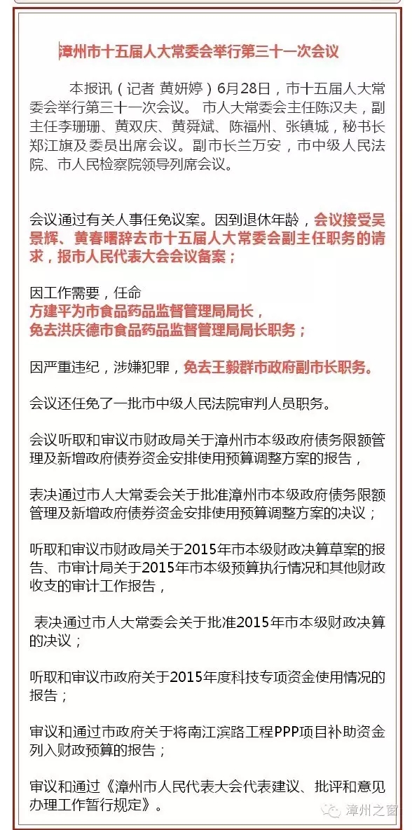 漳州人大任免一批官員、兩位市人大副主任請辭